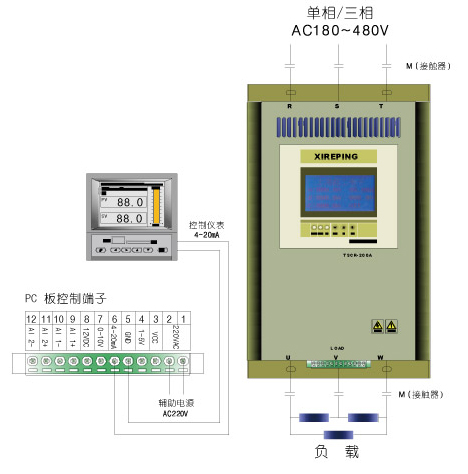 YW--移相控制: 适用于一般电阻式发热丝,远红外线及一般感性负载如变压器负载。
